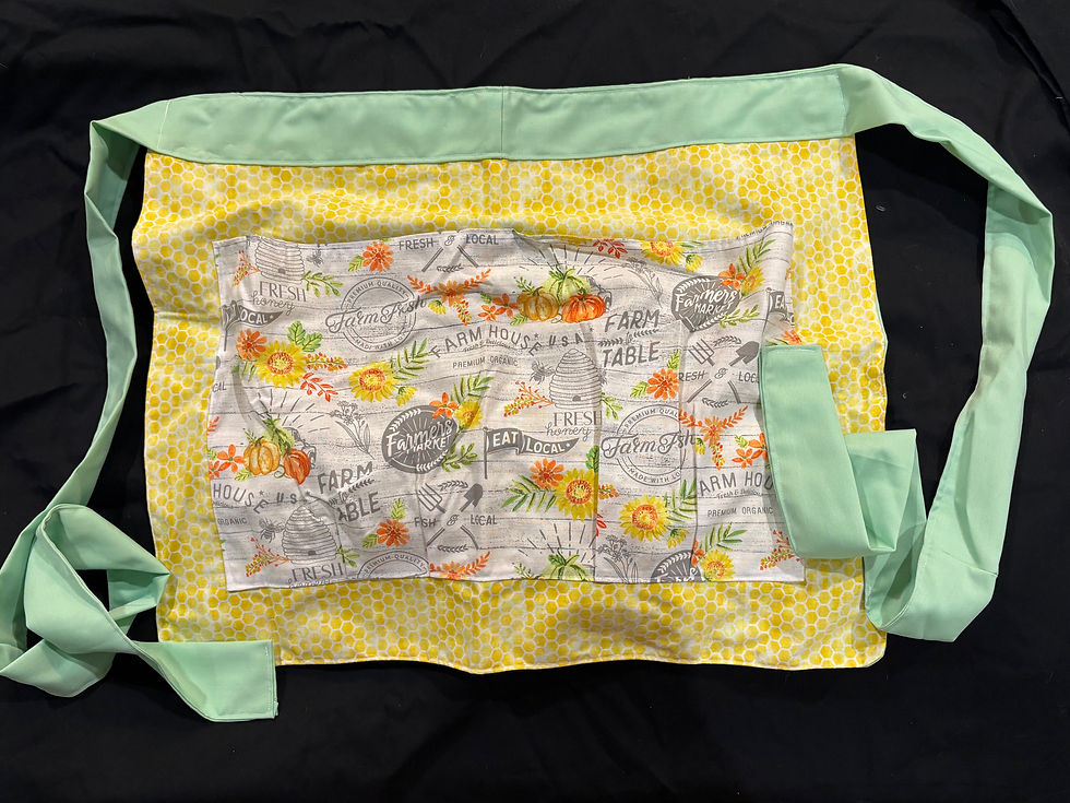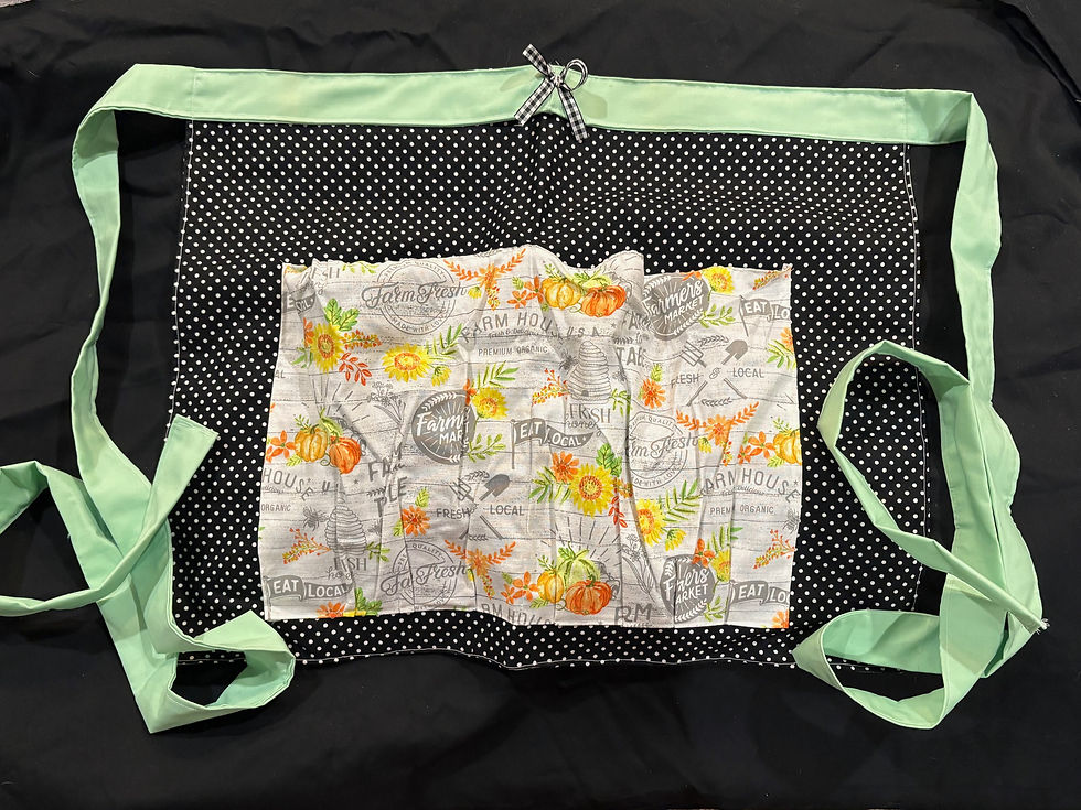 All aprons are hand-sewn using a variety of fabrics and patterns.